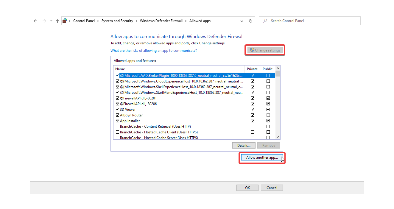 Inside the allowed apps window, click on Change settings button, then on the Allow another app... button.