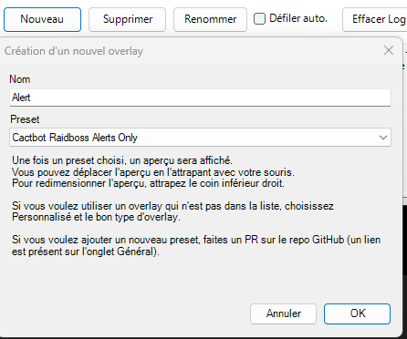 Put "Alert" in Name and for preset select Cactbot Raidboss Alerts Only a block will appear ignore it for now and press ok